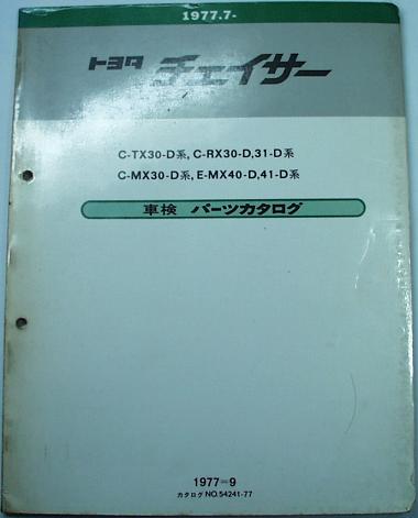 トヨタチェイサーTX30 RX30 MX30 MX40系用:自動車修理工場で使っていたものです。外観はそれなりに劣化していますが、中身は比較的きれいです。一通り見た範囲では落丁、破れ等特に記載しなければならないような瑕疵はありません。 総ページ数:60(変形A4サイズ) 掲載車両:C-TX30,RX30,RX31,C-MX30,E-MX40,MX41系 このカタログには、車検、定期点検、一般整備における交換頻度の高い部品を収録してあります。