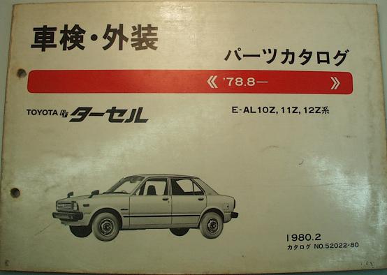 トヨタターセルE-AL10Z AL11Z AL12Z用:自動車修理工場で使っていたものです。外観はそれなりに劣化していますが、中身は比較的きれいです。一通り見た範囲では落丁、破れ等特に記載しなければならないような瑕疵はありません。車検・外装用のパーツカタログです。 総ページ数:103